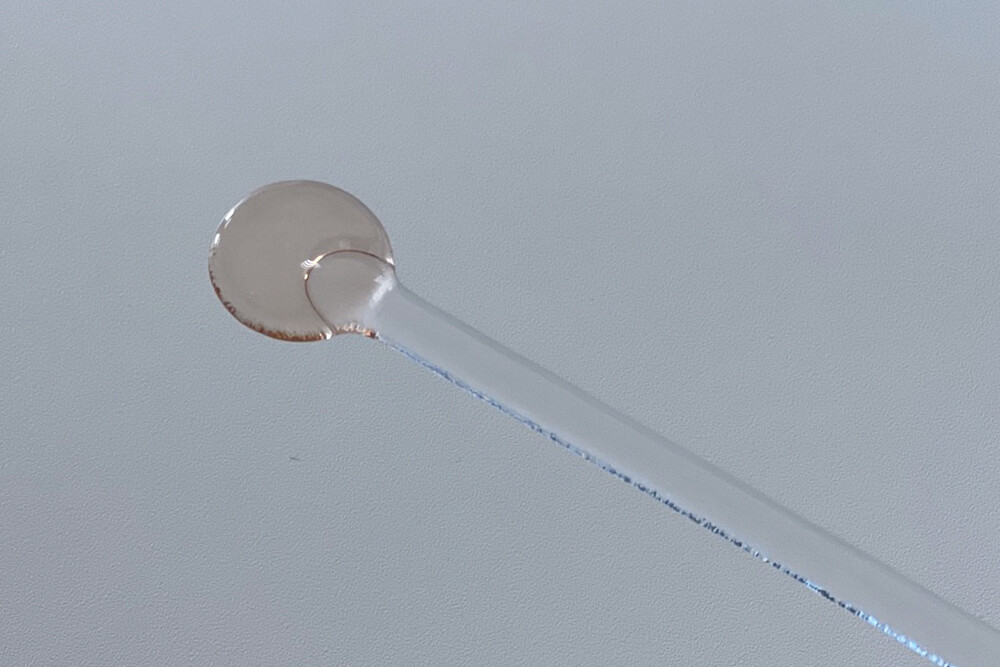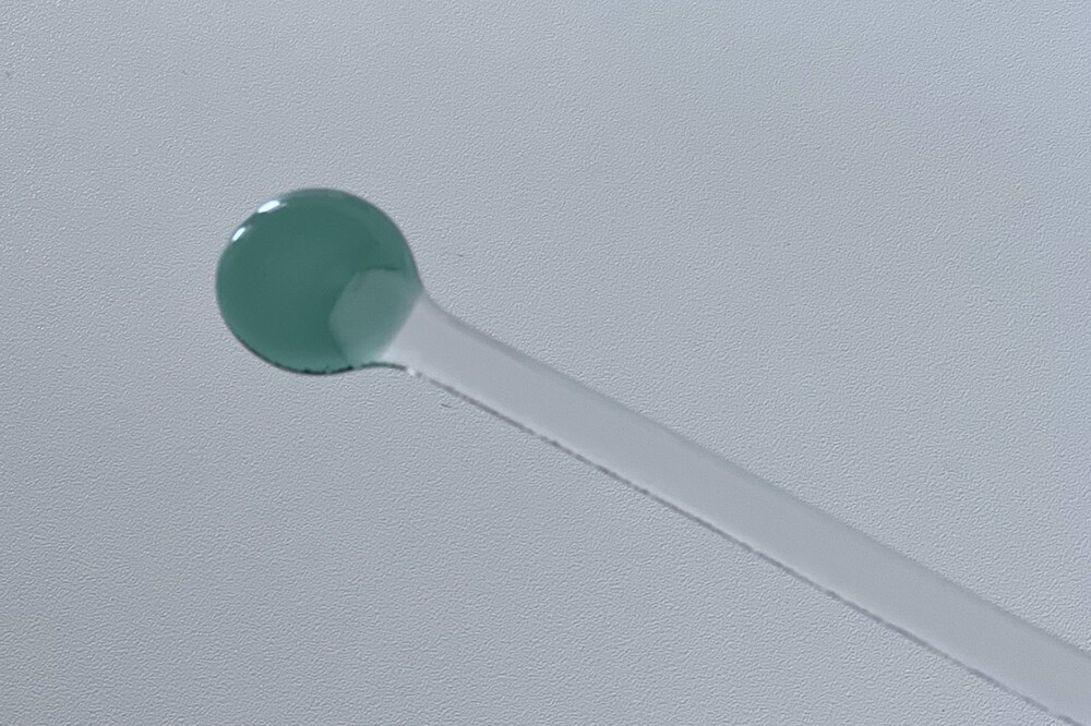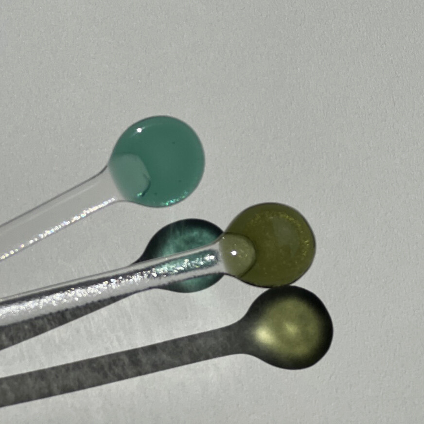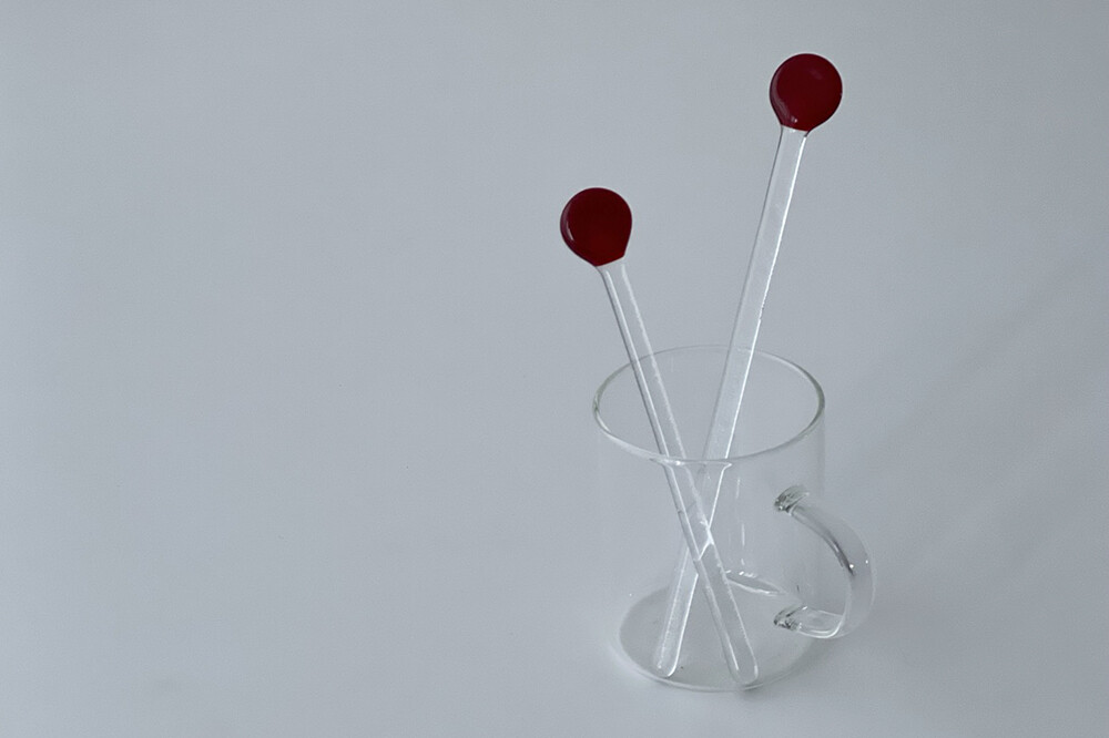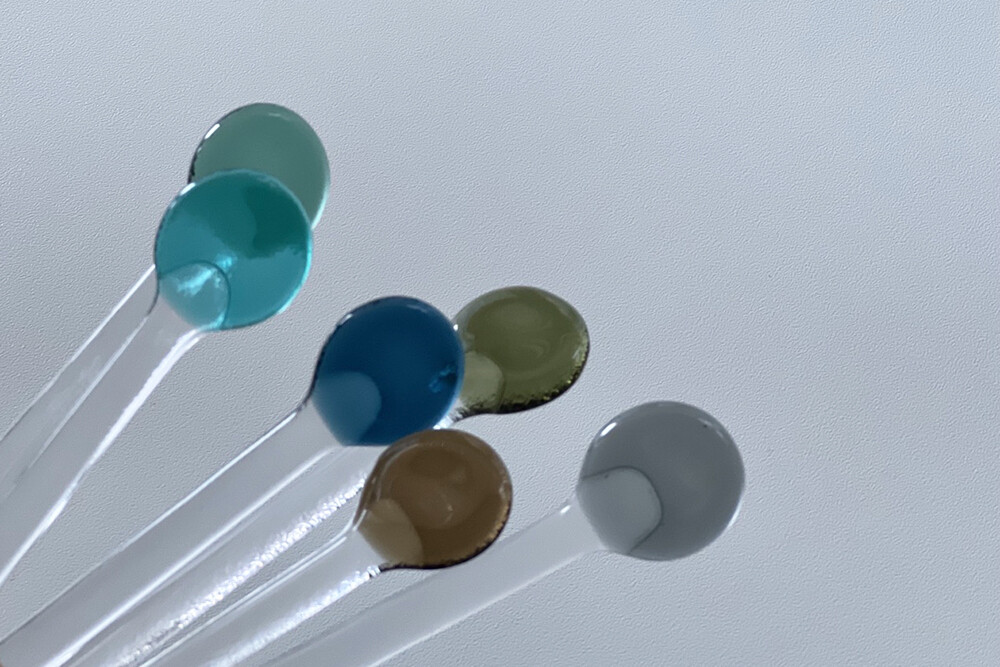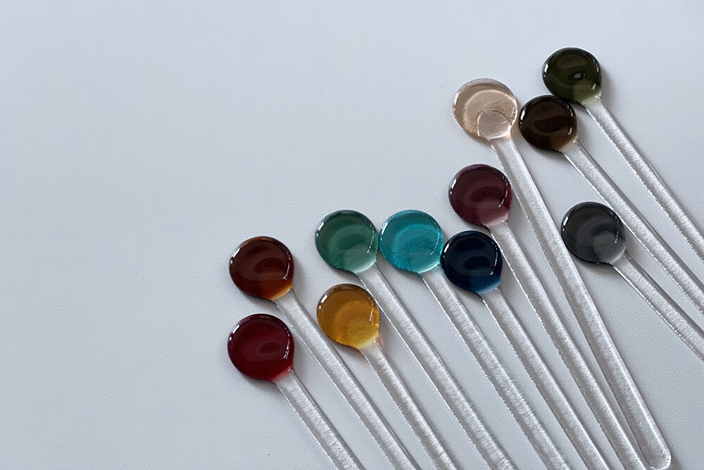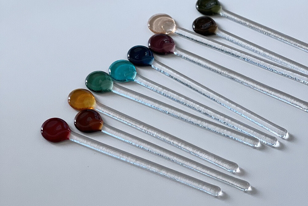길고 투명한 막대의 한 쪽 끝, 작고 둥근 색유리를 붙여 마치 막대사탕 같은 모습입니다.