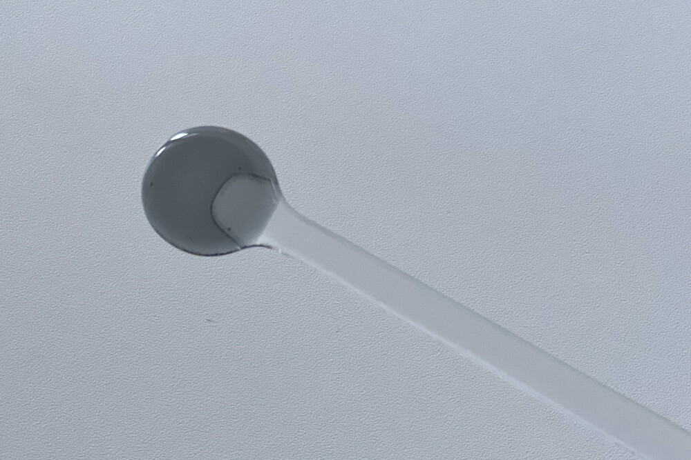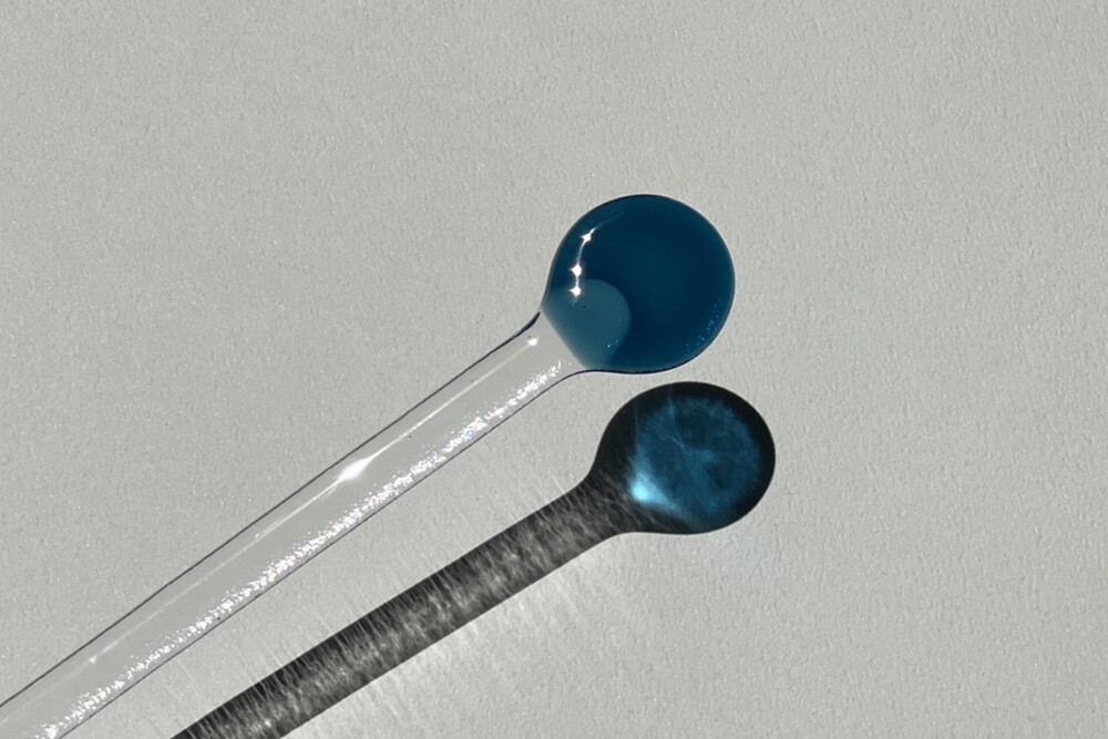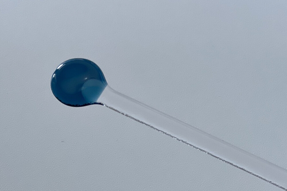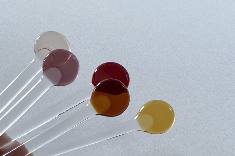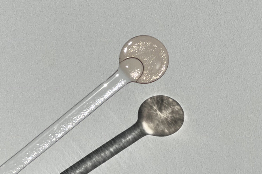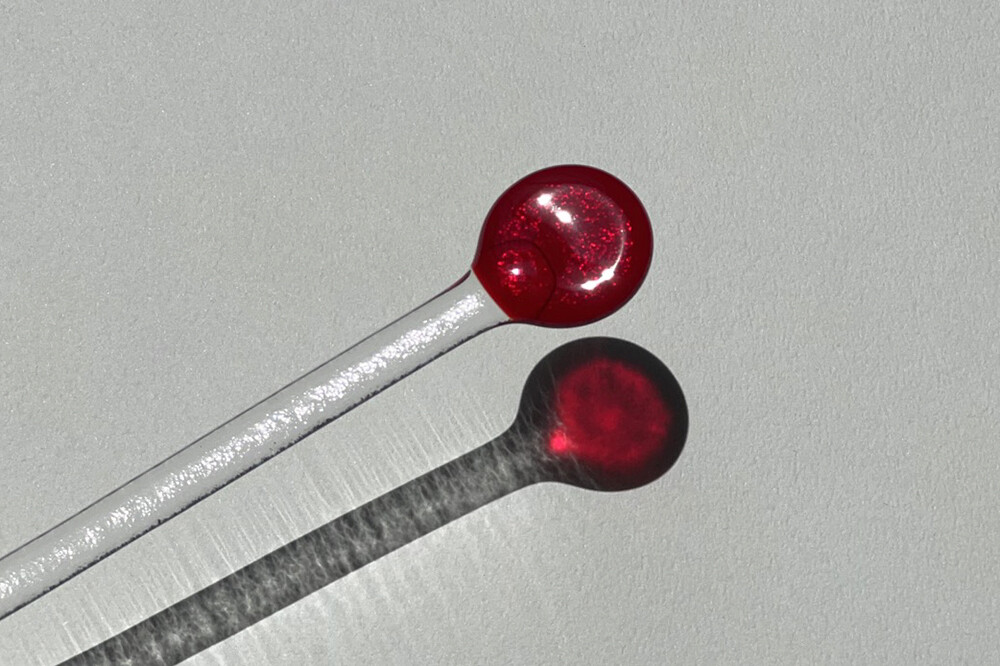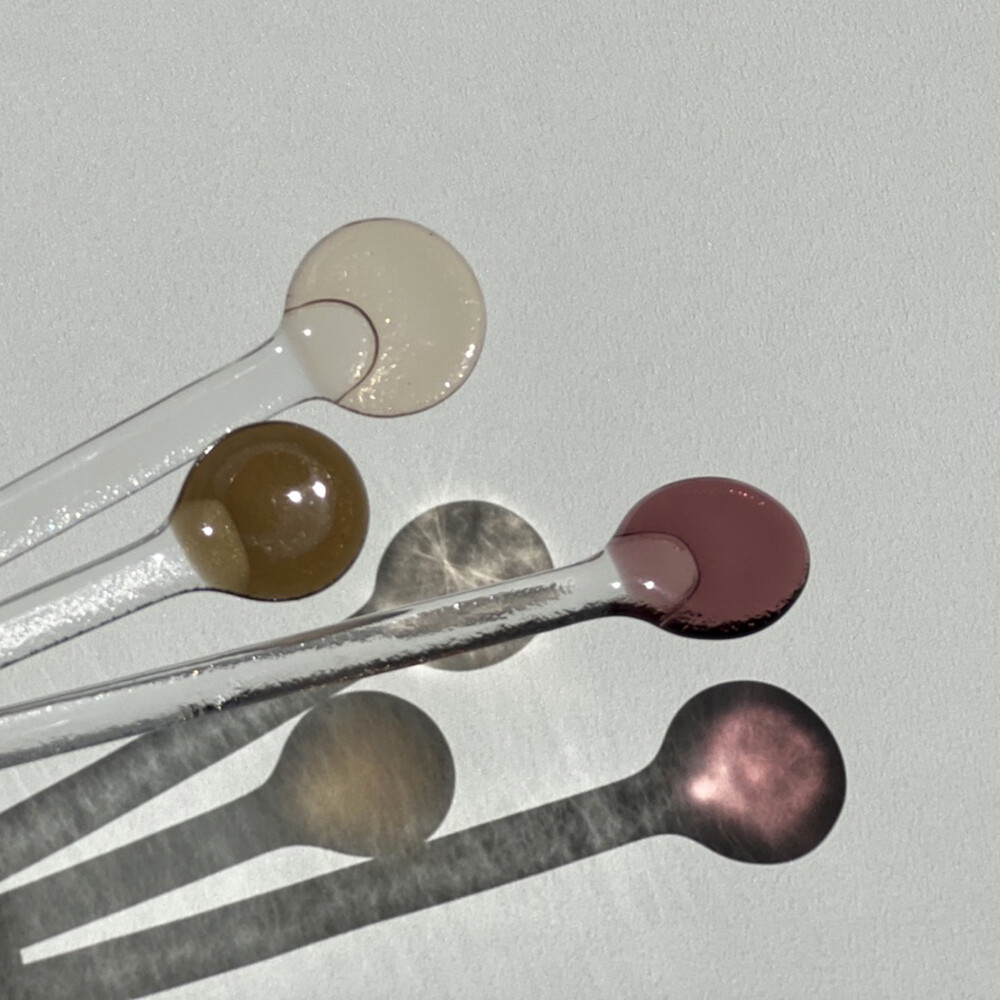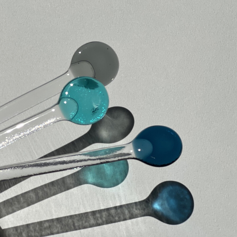 길고 투명한 막대의 한 쪽 끝, 작고 둥근 색유리를 붙여 마치 막대사탕 같은 모습입니다.