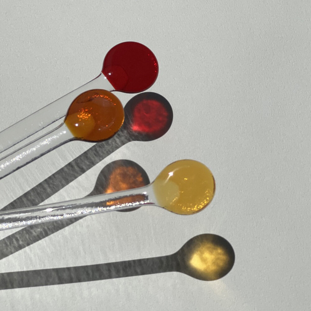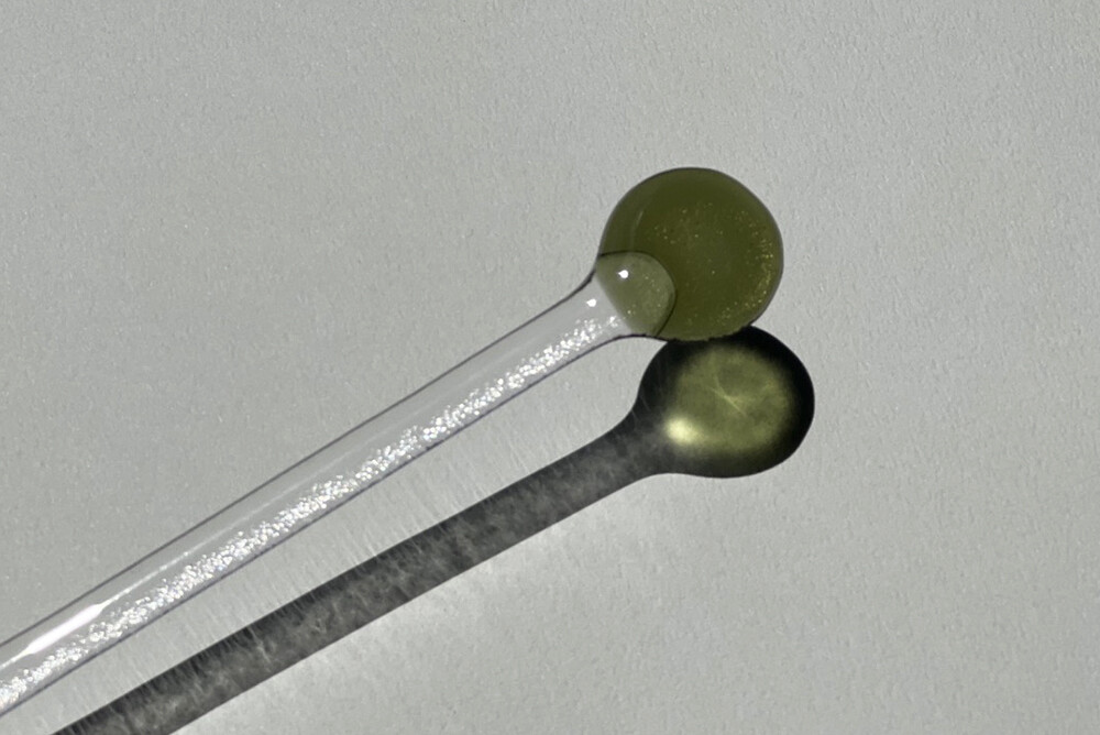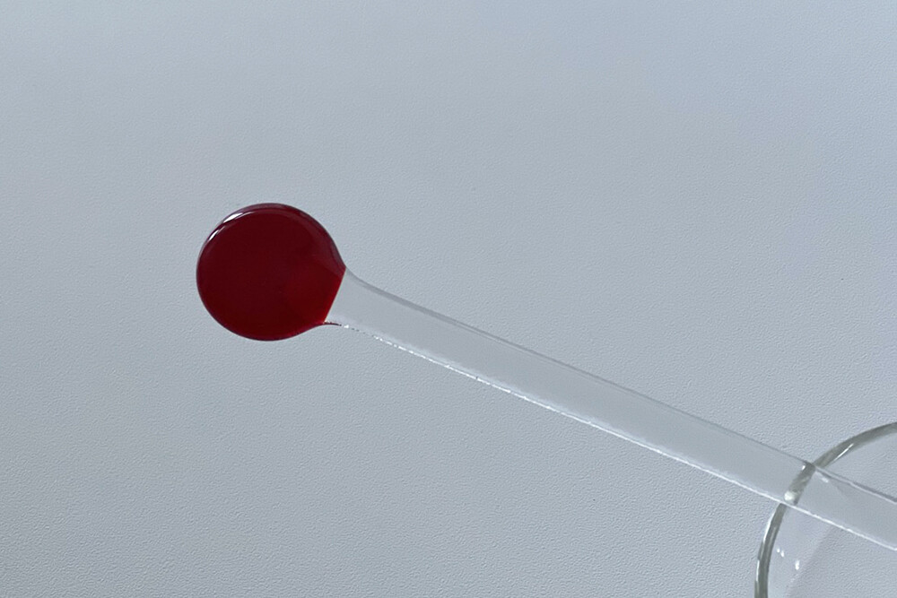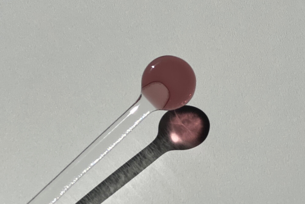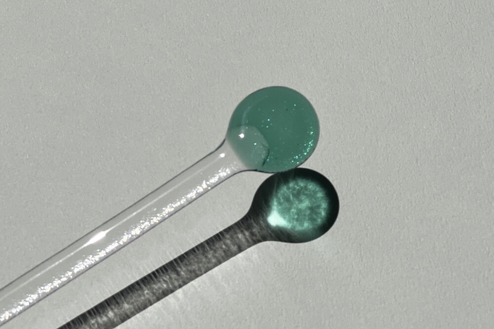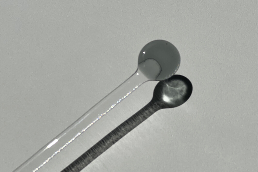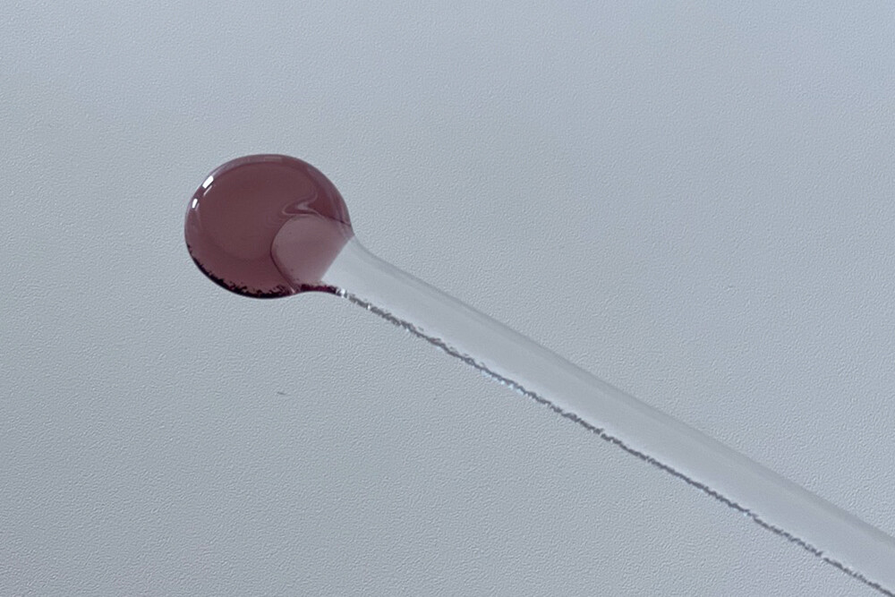 길고 투명한 막대의 한 쪽 끝, 작고 둥근 색유리를 붙여 마치 막대사탕 같은 모습입니다.