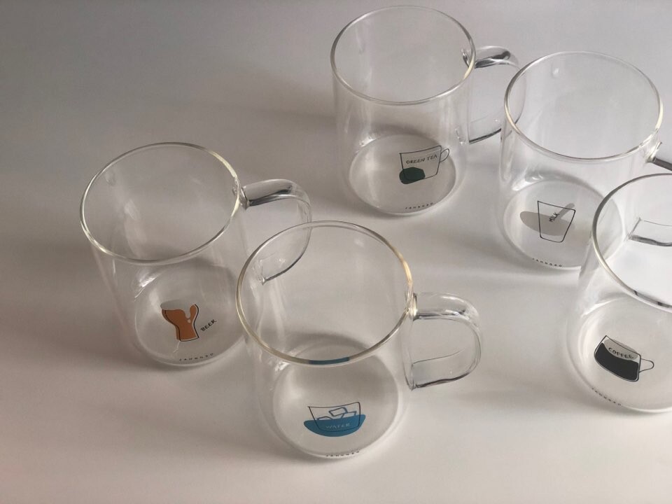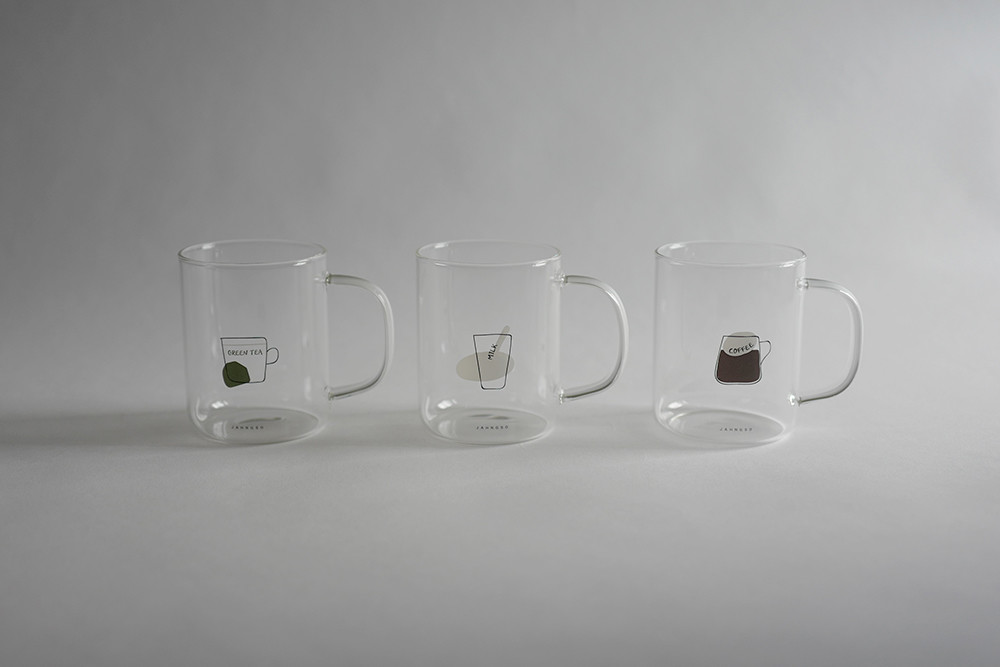 따뜻한 음료와 잘 어울리는 세 가지 일러스트레이션이 그려진 유리머그 입니다.