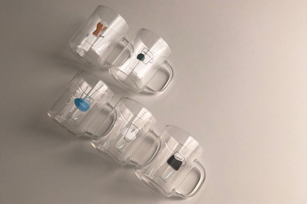 감각적인 일러스트가 그려진 유리컵, CUPS의 머그입니다.