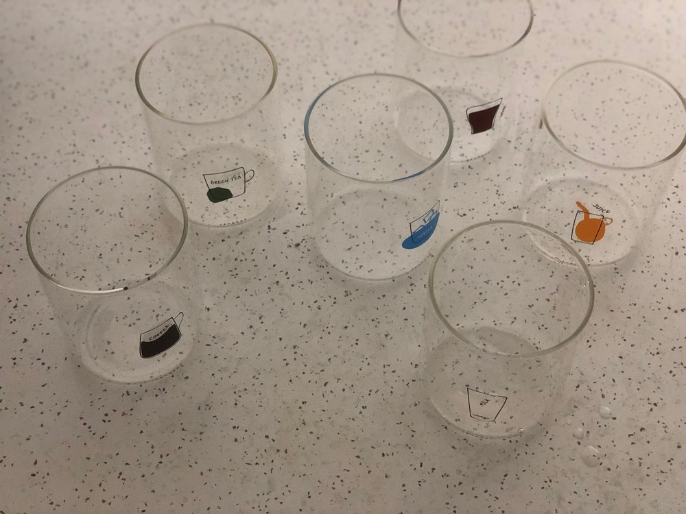 물 water, 주스 juice, 그린티 green tea, 커피 coffee, 우유 milk, 와인 wine 컵 입니다.