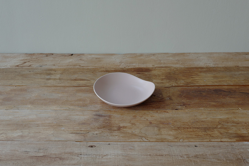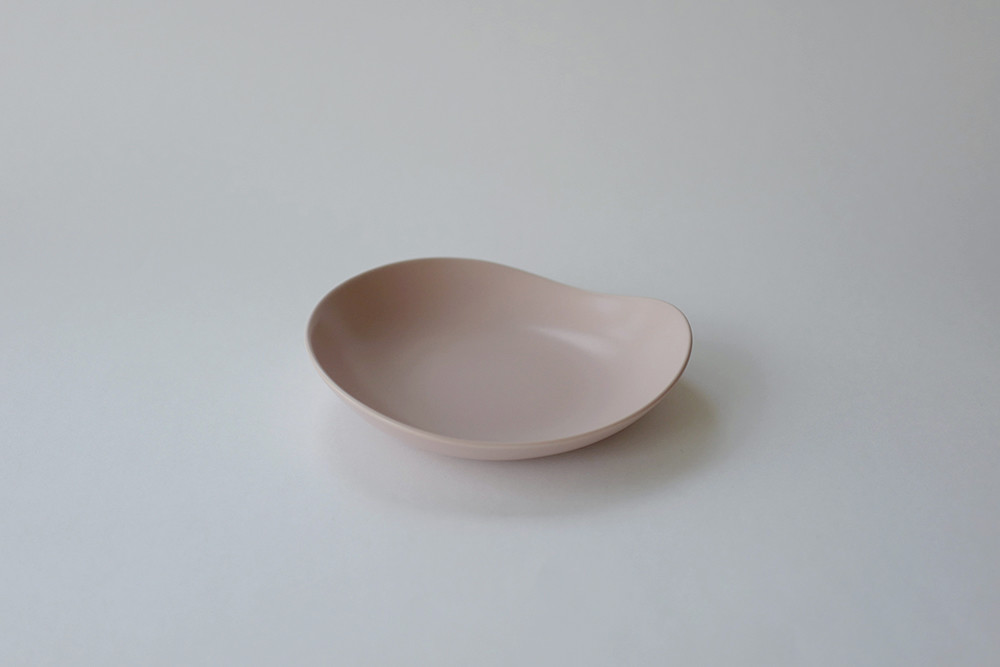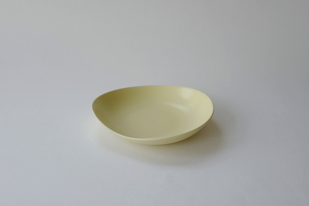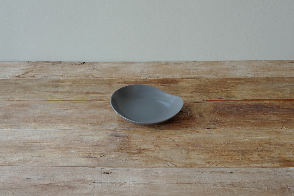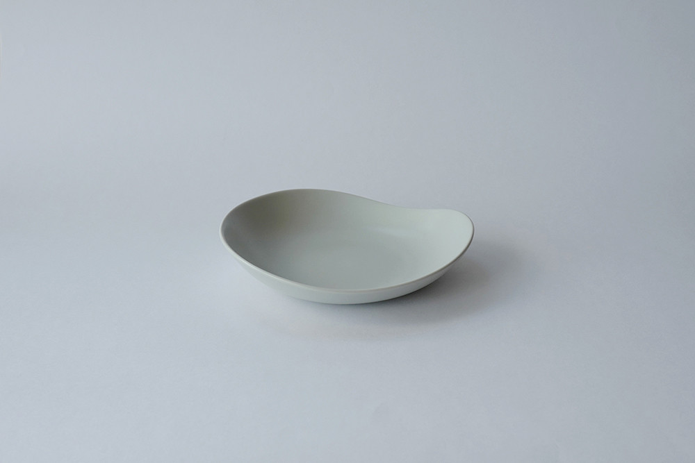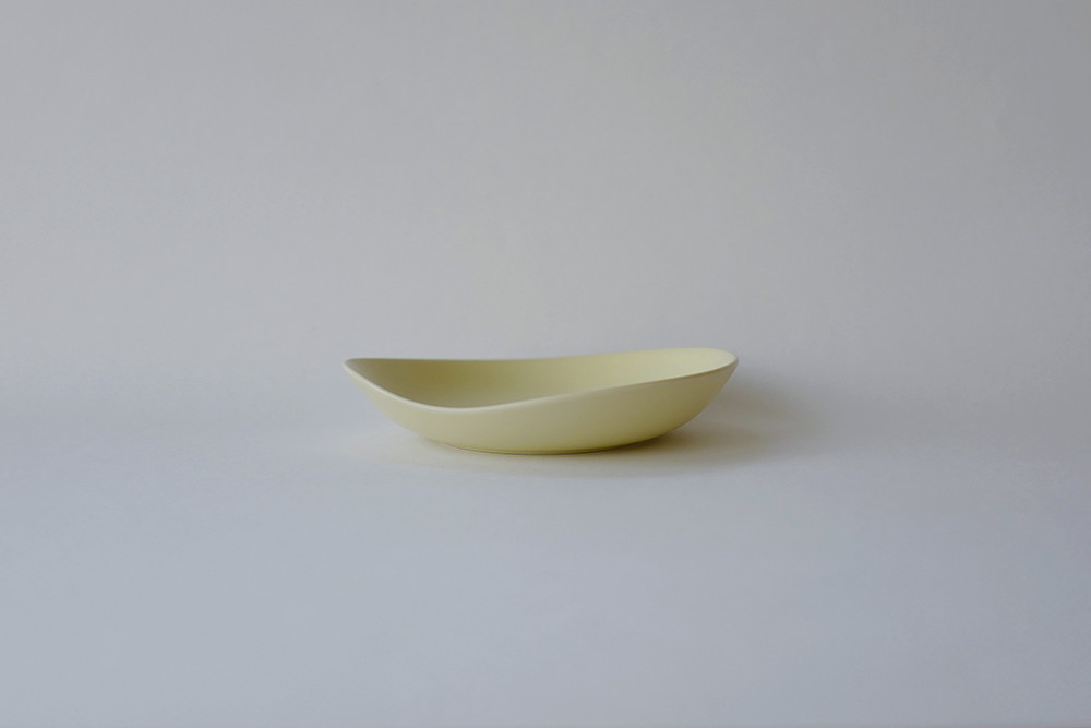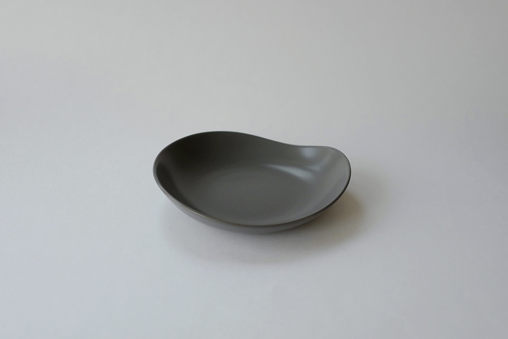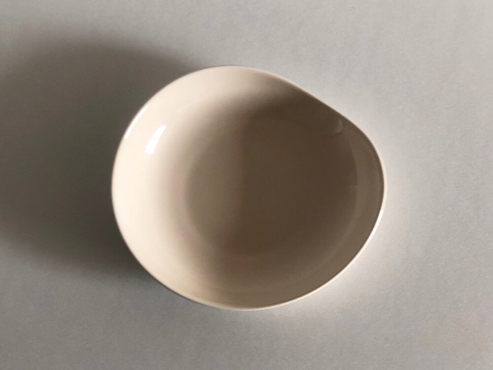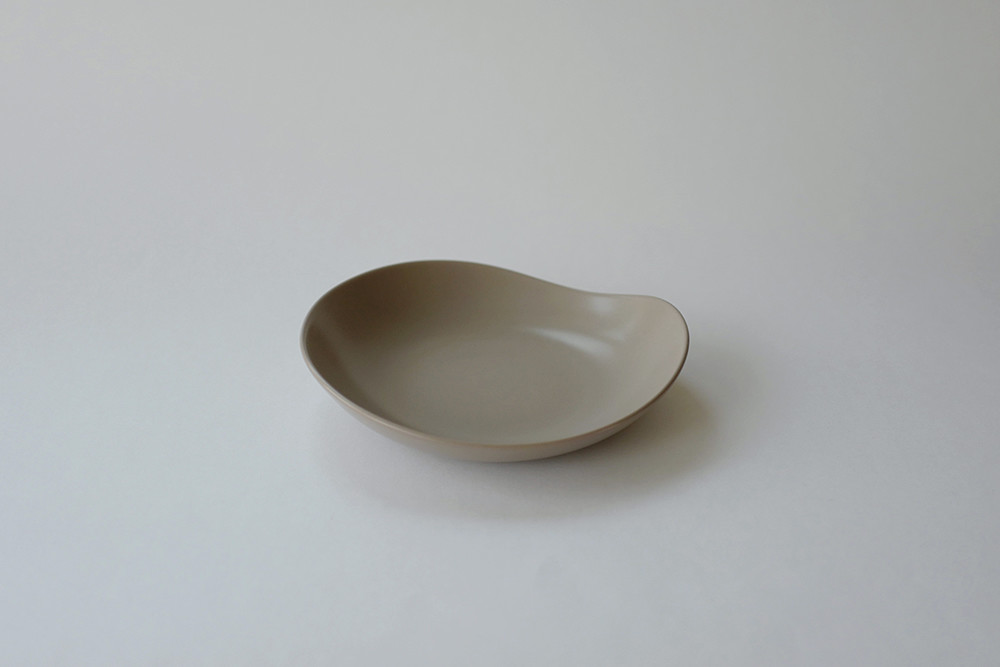비대칭 타원형의 평평한 굽과 낮은 동근 벽을 가진 기물입니다.