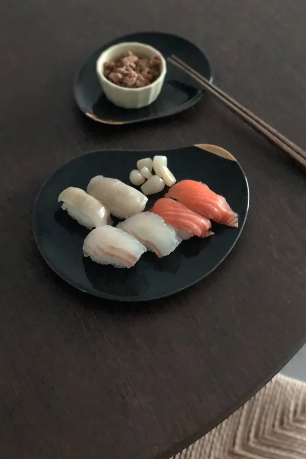 플레이트 한 쪽, 곡선 커브의 끝지점에 금을 입혀 유광에 어울리는 반짝임을 더하였습니다.