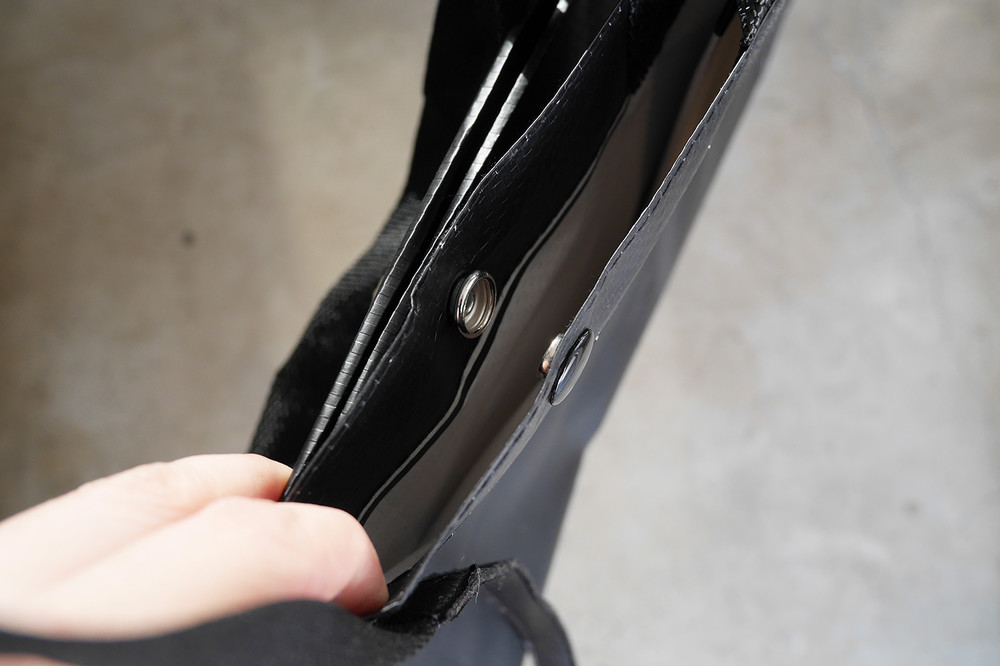 상단에 똑딱이가 달려 있어 내용물이 쏟아지지 않도록 여밀 수 있습니다.