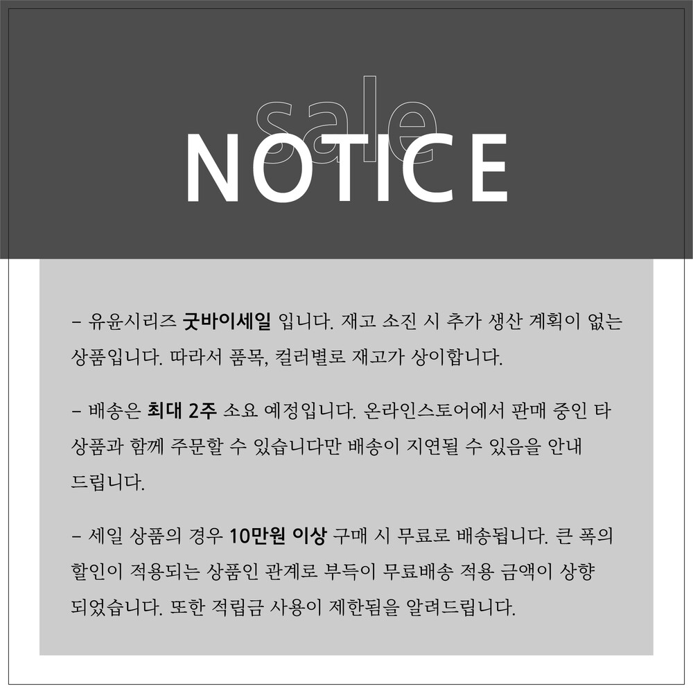 - 상품의 재고가 없을 경우 주문 생산까지 시간이 걸릴 수 있습니다. 이 경우 고객님께 따로 연락을 드리오니 양해 부탁드립니다.